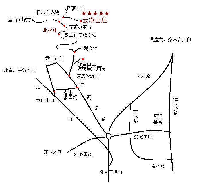 天津市蓟县官庄镇砖瓦窑村(以上地图可搜到),从市区沿金钟河大街上津蓟高速,【一是从盘山出口下高速(60元高速费),出收费站后右转直行约2公里至官蓟公路左转(往营房旅游村方向)】;【二是从蓟县出口下高速(55元高速费,不要往盘山北京方向开),绕环岛,往盘山方向走官蓟公路,过盘山滑雪场路口,往营房旅游村方向继续前行】,到营房桥前叉路口右转(不要直走,否则去盘山正门方向),走财税局疗养院也叫静寄山庄左边上山公路,过联合村,与上山观光电瓶车同行,先到盘山售票站(说去师大李老师家,不用买票),再过北少林,经10分钟左右,路过学武农家院,延路有一大叉路口(标识为杨忠山庄),沿右侧水泥路开100米见右侧“云净山庄”标识,上坡即到。单程145公里,行程约2小时。山路驾驶经验不足者,请选择代驾或租车上山。